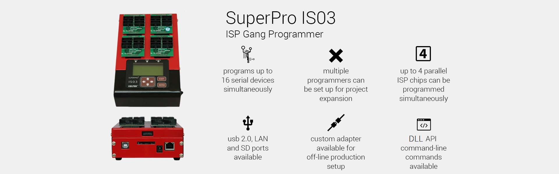 Automated IC programming lends an efficient and cost-effective solution to volume production. Xeltek's SuperPro® SuperBOT series delivers a full line of automated 24/7 workhorses, eliminating human handling and error while improving safety and saving time so workers can focus on more important priorities. With over 115K devices supported and free service and support for 5 years, learn how Xeltek can help satisfy your most demanding programming needs.