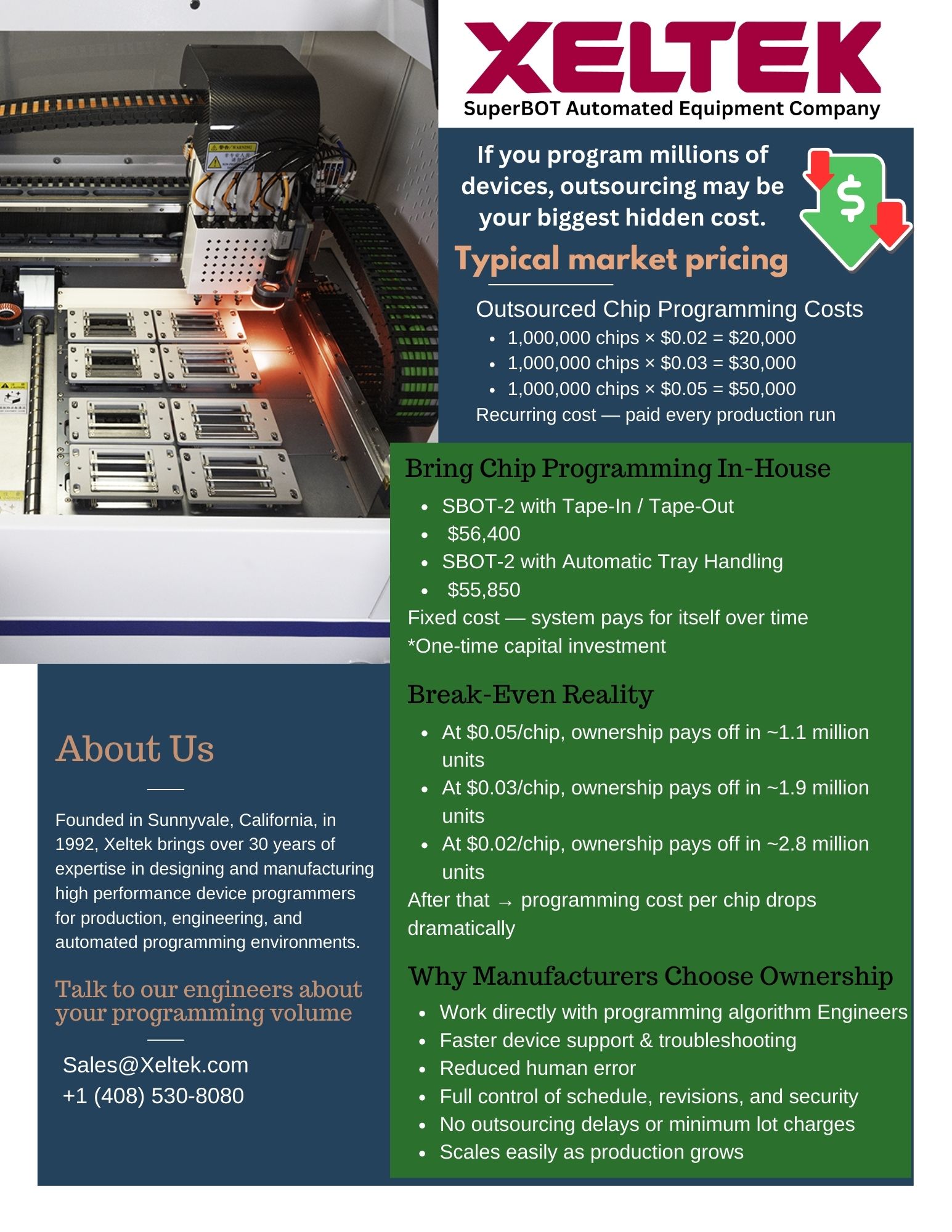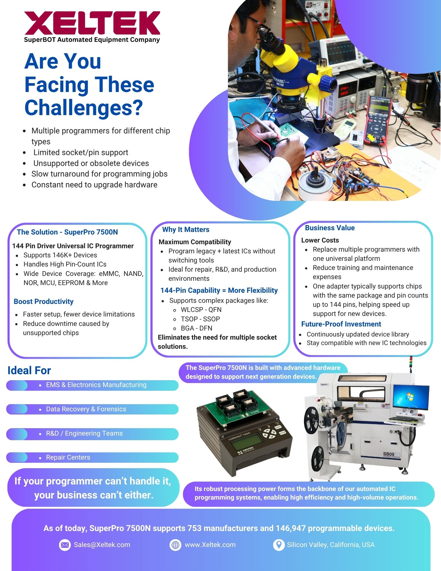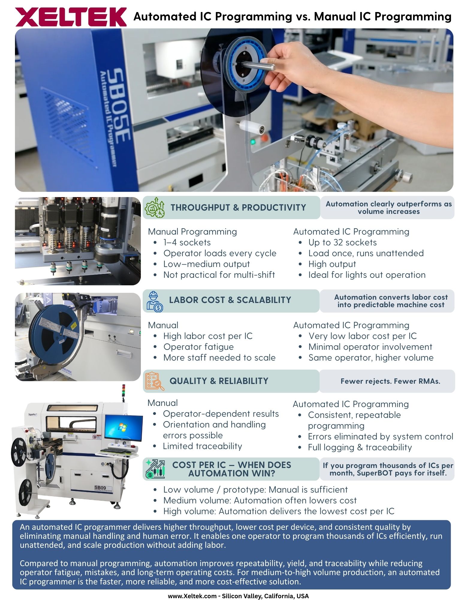 Automated IC programming lends an efficient and cost-effective solution to volume production. Xeltek's SuperPro® SuperBOT series delivers a full line of automated 24/7 workhorses, eliminating human handling and error while improving safety and saving time so workers can focus on more important priorities. With over 115K devices supported and free service and support for 5 years, learn how Xeltek can help satisfy your most demanding programming needs.