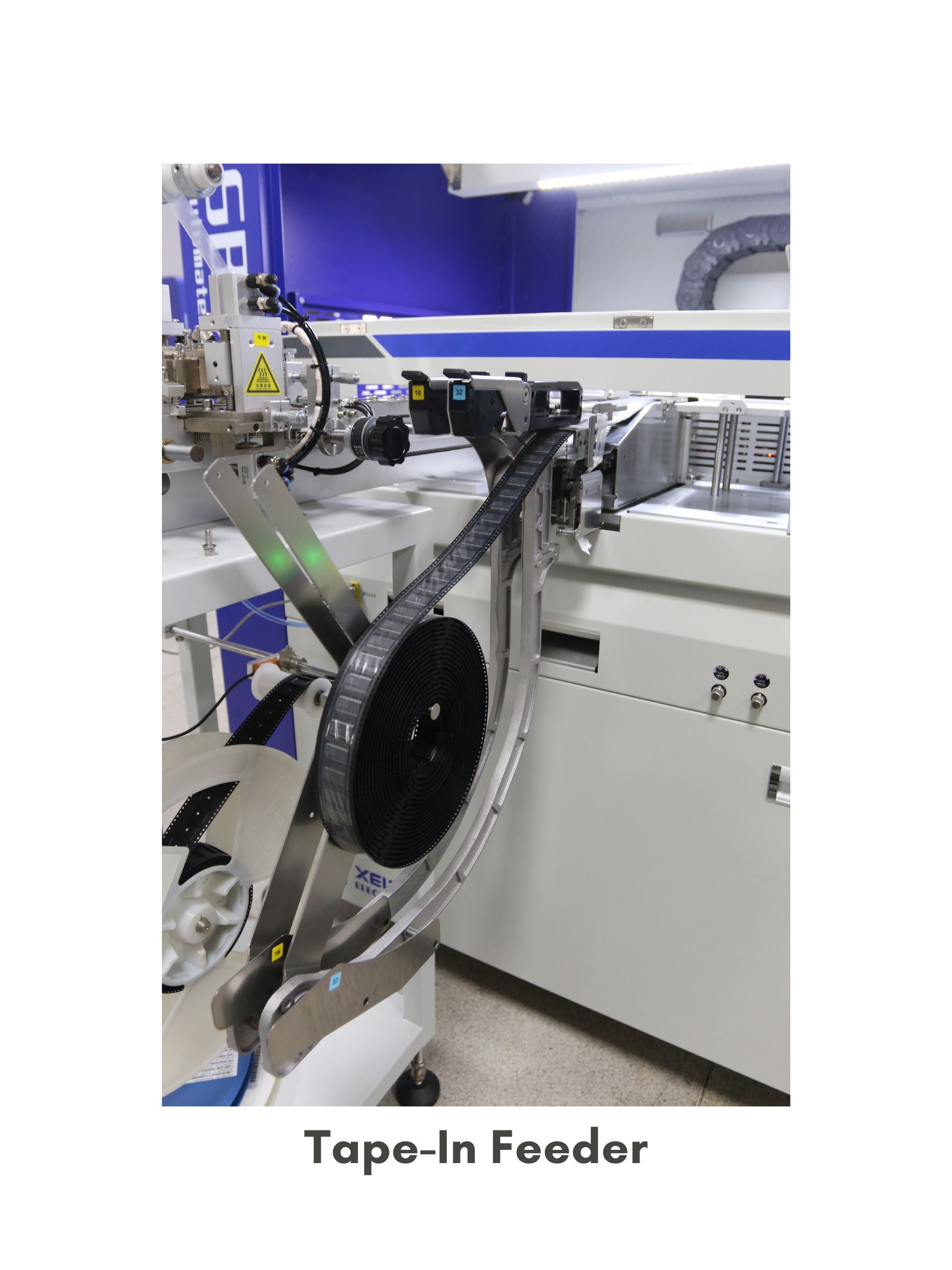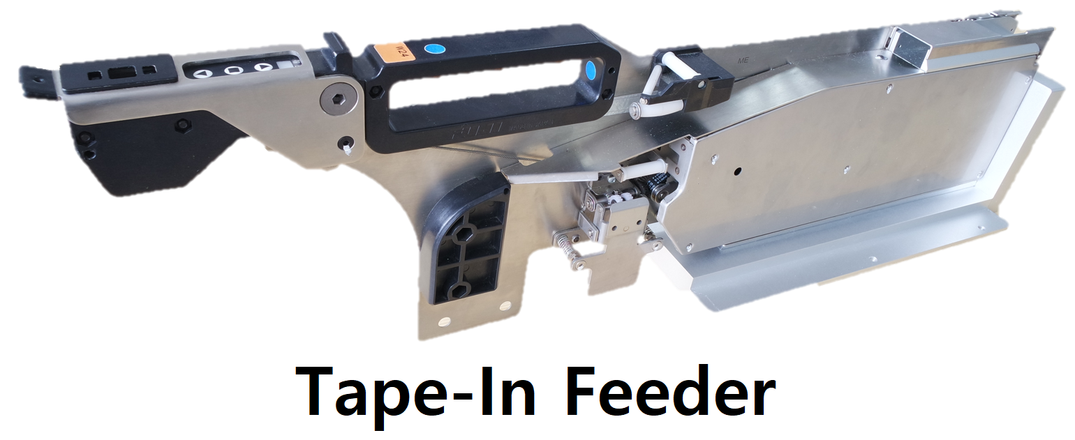 The Automated Tape-In Feeder supports electric tape widths from 8mm to 44mm, ensuring compatibility with various chip sizes for seamless automated loading.