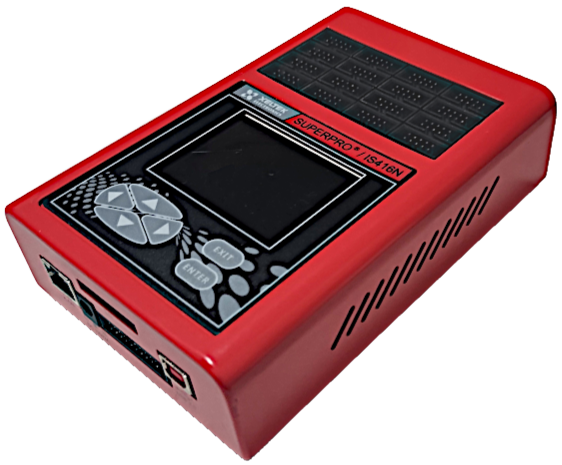 Superpro IS416N is a universal ISP Gang programmer which supports devices with almost all serial protocols. Programs up to 16 serial devices simultaneously. Up to 4 parallel devices like eMMC, NAND, NOR FLASH can be programmed in system simultaneously. USB2.0 or network remote and stand-alone operation modes. DLL/API/Command-Line Commands available under license for integration with ICT, FCT, ATE and testing fixture.