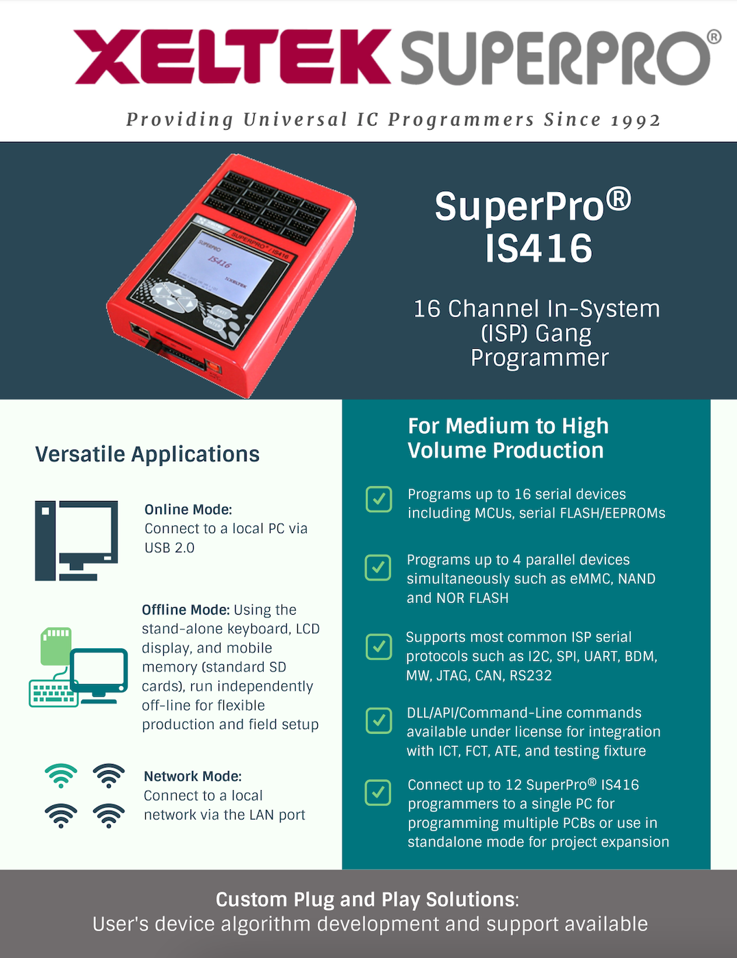 Because one size doesn't always fit all, get a custom quote and solution with the SuperPro® IS416 16-channel gang programmer.